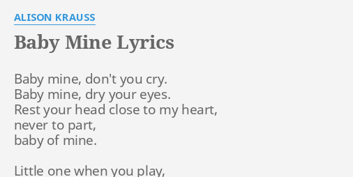 Baby mine Dont you cry Baby mine Dry your eyes Rest your head close to my heart Never to part Baby of mine Little one When you play Dont you mind what they say. Baby mine dont you cry. Baby mine dont you cry Baby mine Dry your eyes REst your head close to my heart Never to part baby of mine Little one when you pla.